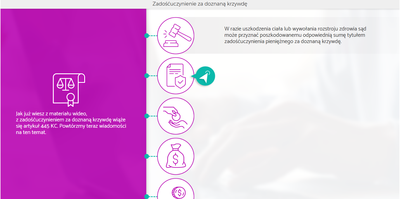 - zapoznają się z zasadami ustalania wysokości zadośćuczynień, odszkodowań i rent,