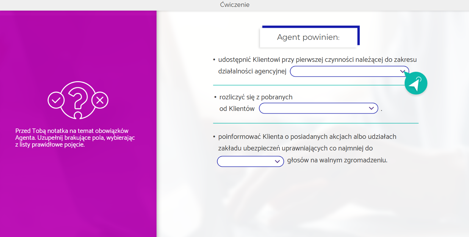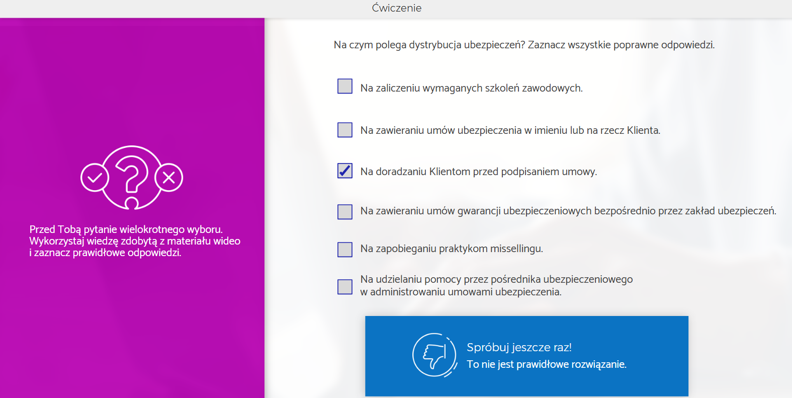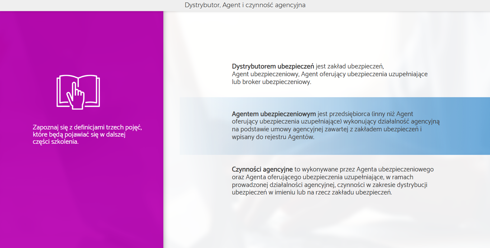 Od 1 października 2018 roku obowiązuje nowa ustawa o dystrybucji ubezpieczeń. Wprowadza ona wiele zmian prawnych dla agentów ubezpieczeniowych i brokerów. W odpowiedzi na te zmiany przygotowaliśmy szkolenia e-learningowe, które z jednej strony precyzyjnie wyjaśniają nową rzeczywistość prawną, a z drugiej pozwalają na realizację wymogu uczestnictwa w 15 godzinach szkoleń rocznie. Obowiązki agenta w świetle ustawy o dystrybucji ubezpieczeń jest częścią cyklu IDD.
